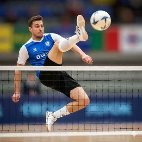 Cette discipline spectaculaire se joue en simple, double ou triple, sur un terrain divisé par un filet, avec une balle qu’il faut faire passer au-dessus… sans utiliser les bras ni les mains.